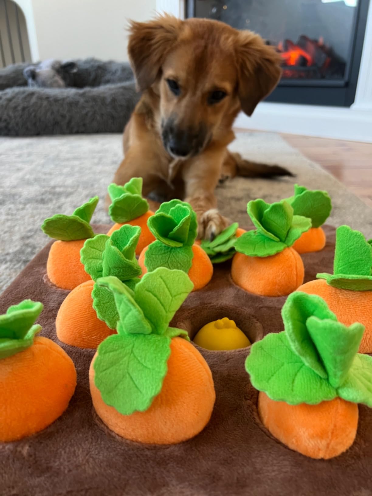 My dog absolutely LOVES the SnuggleCarrot™! 🥕💛 It's the perfect mix of cuddly and fun. She carries it everywhere and even sleeps with it! The durability is amazing, and it's quickly become her favorite toy.